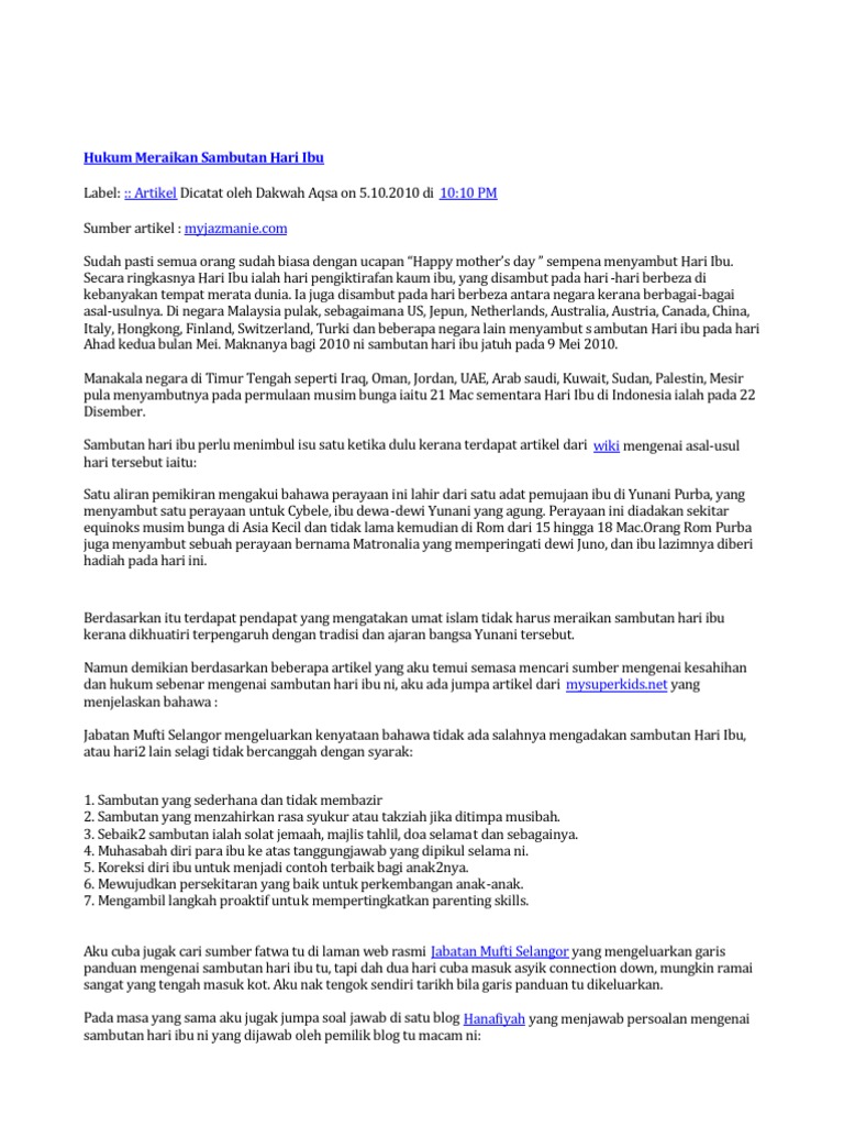 1) tidak menganggap hari ibu sebagai perayaan dalam kerangka syarak seperti aidilfitri dan aidiladha. Saya melihat isu seperti ini lebih kepada istilah sahaja di mana hakikat perayaan dalam islam hanya dua, iaitu hari raya aidilfitri dan hari raya haji. Hukum puasa bagi ibu hamil/menyusui, dapat ditinggalkan dengan cara menggantinya (mengqadhanya) dan/atau membayar fidyah. Terima kasih untuk semua yang. Sambutan hari ibu yang diraikan sebagai tanda menghargai pengorbanan dan usaha ibu dalam membesarkan sehingga menjadi manusia yang berjaya.
