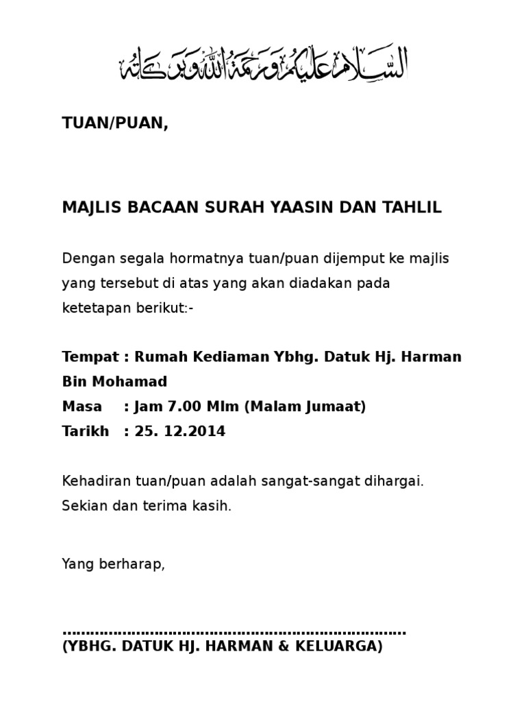 Surat pernyataan ahli waris diperlukan sebagai bukti pemberian kuasa kepada salah satu ahli waris untuk menjual rumah atau tanah hasil warisan. Dalam membuat acara tahlilan, untuk mengundang orang, tetangga ataupun masyarakat diperlukan sebuah surat undangan. Jemputan kenduri kesyukuran/tahlil/doa selamat md nasib bin rahin & saidah binti othman dengan segala hormatnya menjemput tuan/puan ke majlis di rumah kami pada :tarikh : Setiap orang yang membutuhkan informasi tentang acara atau kegiatan yang hendak dilaksanakan tentu sebelumnya perlu pemberitahuan lebih dulu agar memperoleh penjelasan secara detail, tentang tema acara, waktu. Surat pemberitahuan adalah sebuah surat yang berisi informasi dan memiliki kegunaan untuk menyampaikan informasi tersebut dari si penulis ke si penerima atau pembaca.